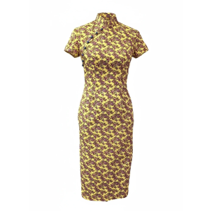Yellow and Pink Floral Cotton Cocktail Cheongsam with Pearl Buttons